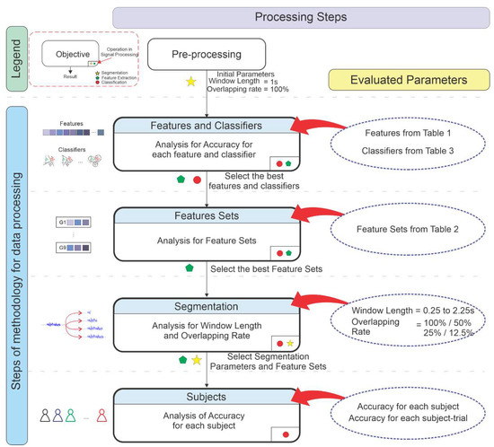 The results are presented following the stages described in the methodology (Figure 4). Firstly, the accuracy for each feature and classifier are presented individually, followed by the analysis of feature sets. Posteriorly, the influence of segmentation is considered and the tests for each subject are exhibited. Finally, the results are compared with those presented in the literature (related works).