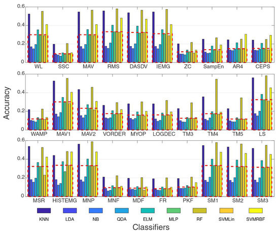 A mean for the performance of all classifiers was extracted (presented by the dashed lines) to identify the best features and classifiers in this scenario. Regarding the classifiers, one can note that four of them had accuracies of up to the mean: KNN, ELM, RF, and SVMRBF. This behavior can be noted in similar works for sEMG signals that were compared with different classifiers [53,64]. Because of these values, these four classifiers were analyzed more comprehensively, aiming to reduce the computational effort.