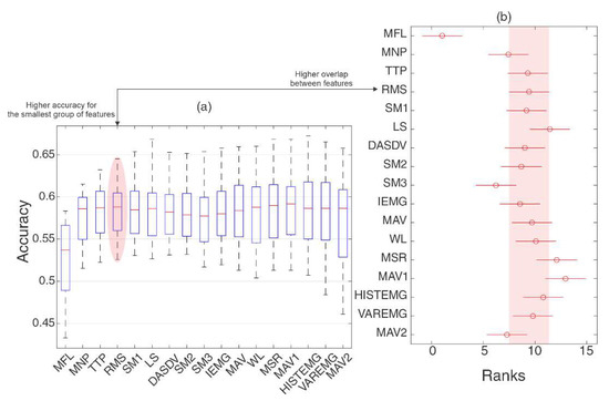 The feature set G9 was composed of the four best features from G6 that demonstrated high classification accuracy with a reduced number of features. The reduction was based on the statistical dependency of the distribution after the pattern recognition process (using a Friedman test and Tukey’s post-hoc test for multi-comparison, p > 0.05) and the following features were selected: MFL, MNP, TTP, and RMS. This process is presented in Figure 6, composed of the features with the highest accuracies in G6 and the best four classifiers (ELM, KNN, RF, and SVMRBF). Figure 6a presents the accuracy rates obtained with the increase of each feature for the classification. It can be noted that when increasing the number of features, their medians stabilized for four features (up to Root Mean Square, RMS). After this, there was no significant gain and the coverage of distribution was more concentrated. In Figure 6b, it can be noted that the distribution of these four features overlaps for almost all distributions (except the first). The four features presented equivalent distribution when more features were inserted into the classification (Figure 6b), besides that the range of their distribution (denoted by the whiskers of Figure 6a) covered the values when more features were introduced into the classification. With these definitions, the next analysis was the influence of the feature sets.