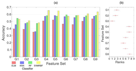 Figure 7 presents the classification performance for the feature sets from the literature (G1 to G5) and the features with high hit rates in the previous section (G6–G9). The KNN, ELM, RF, and SVMRBF classifiers were considered in this analysis due to their high accuracies in the individual feature analysis. It can be noted that the accuracies show a slight increase using feature sets compared to the use of individual features, with means ranging from 40% to 60%. The best classifier for the feature sets alternated between RF and SVMRBF.
