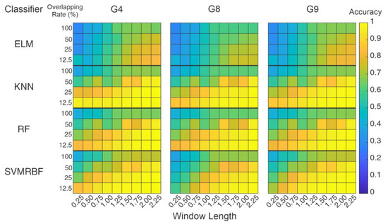 As the previous analysis consisted of fixed values for window length and overlap rate, the next step, shown in Figure 4, was the variation of segmentation parameters. Figure 8 presents the results obtained for the variation of the overlap and the window size for the classifiers (ELM, KNN, RF, and SVMRBF) and the feature sets with high performance (G4, G8, and G9). Each color represents a level of accuracy, as demonstrated by the color bar. Dark blue represents the lowest accuracy whilst light yellow represents the highest one.
