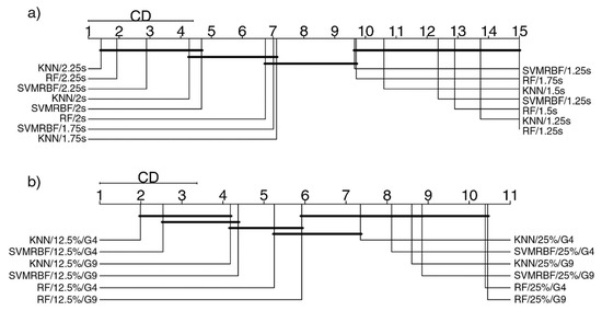 ELM and the G8 feature set had the lowest accuracies. The other classifiers had similar results, both for overlap and window length, and G4 and G9 presented similar distributions. Still, a window length of 2.25 s had high accuracy; such a length needs to search for a window length with the same distribution with a lower number of segments in a window. An analysis in groups was performed, using a Friedman test and a Nemenyi post-hoc test (p > 0.05) and considering the groups containing the segmentation parameters. Based on their results, critical distance diagrams (CD) were performed and are presented in Figure 9. These diagrams list the groups with the best ranks on the left and distributions without statistical difference are connected with a solid line [67]. Figure 9a presents the comparison related to the classifiers and window length. It can be noted that segments of 1.75 s have similar distributions to 2.25 s and 2 s, even though the latter two present the best performance rates. Figure 9b presents the analysis of classifiers and feature sets from the overlap rate. The overlap rate of 12.5% showed ranks placed differently than 25%; however, there were areas of overlap between them.