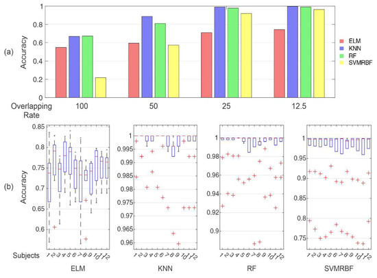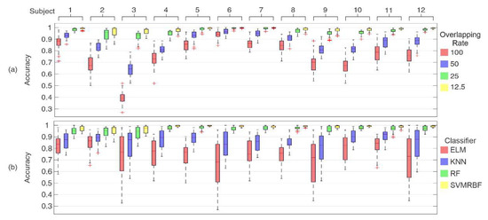The same behavior regarding the influence of the overlap rate could be observed in all subjects, as presented in Figure 10a. The distributions were concentrated close to the medians, with a low rate of outliers. Some subjects had a high increase in accuracy changing the overlap of the segments. This can be noted in subject 3, which exhibited an accuracy improvement from 40% to 90%. For other subjects, such as 6 and 7, the gain in accuracy was around 20%, with a hit rate of close to 100%. On the other hand, Figure 10b shows that some classifiers had more concentrated distributions, independent of the subject. This was the case with the RF and SVMRBF classifiers, which presented accuracies close to 100% for all subjects independent of the overlap of the segments. ELM and KNN demonstrated a large range in the distributions for more than one subject (i.e., subjects 3, 6, 9, and 12). In this way, these classifiers presented a higher dependence on the subjects compared to RF and SVMRBF.