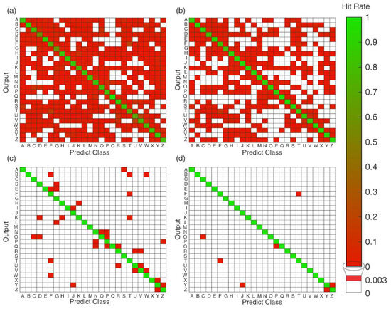 Using the obtained results for the RF classifier for the acquisition trails validation, Figure 12 presents the confusion matrix for the 26 classified gestures. The color bars show the accuracy in each cell, where green cells represent the high hit rates; red cells represent the misclassification samples; and the white cells represent where there was no relevant misclassification (less than 0.3%) values of correspondence. Moreover, the influence of the overlap rate, a parameter that demonstrated a high correlation with the accuracy, is shown. The disruptive windows presented a high dispersion on the hit rates, with an elevated number of false positives and false negatives, until in Figure 12c,d the classes that are more misclassified could be identified.