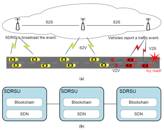 The proposed framework of QcFND is illustrated in Figure 1b. From a high-level point of view, SDRSUs communicate and collaborate with each other, and they constitute the main body of QcFND, a Software-Defined IoV (SDIoV). Each SDRSU contains two modules, i.e., SDN and blockchain.