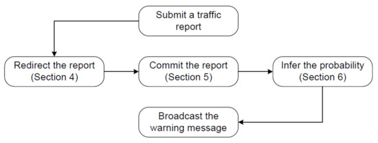 Figure 2 demonstrates the work flow of QcFND and how its modules interact with each other. When a vehicle observes a traffic event, it submits a report about the traffic event to a nearby SDRSU. However, the nearby SDRSU may redirect the report to another SDRSU due to load balancing, not processing the report itself. The load balancer is implemented by SDN, and further details are given in Section 4. Once the report is delivered to blockchain nodes in an SDRSU, it will eventually be written to the blockchain on all SDRSUs. The transaction process is elaborated in Section 5. Whenever a new block is committed, the smart contract infers the possibility of the presence of the traffic event based on the algorithm of Bayesian network. The calculation process is presented in Section 6. Finally, SDRSUs broadcast the warning message on the event occurrence possibility.