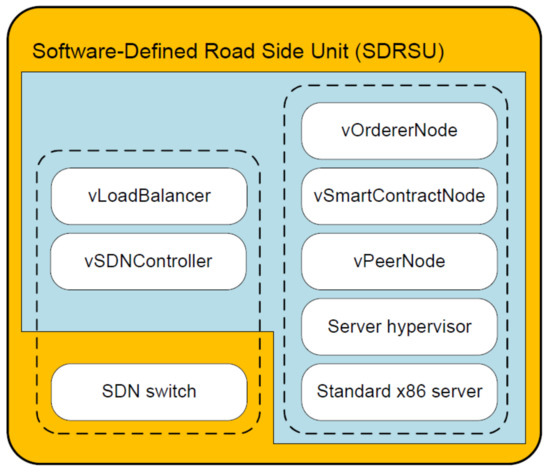 The components of SDRSU are shown in Figure 3. The SDRSU hardware consists of SDN switch and standard x86 server. The former represents the infrastructure layer of a network device in SDN and focuses on the data forwarding functionality. The latter represents the hardware layer during the server virtualization and is a collection of hardware resources for computing, storage, and networking. The SDRSU software is packaged as five virtual machines (VMs), including vSDNController, vLoadBalancer, vPeerNode, vSmartContractNode, and vOrdererNode. The server hypervisor is the virtualization layer sitting on the physical server and abstracts hardware resources into these VMs.