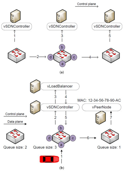 In Figure 4b, we denote the control plane and the date plane with two types of arrows. The process of workload distribution is explained as follows. First, the red vehicle submits the report of a traffic event to the nearby SDRSU. Second, the local SDN controller is informed about the arrival of the report via the SDNP_Packet_In message. Third, the load balancer is asked which SDRSU the report needs to be forwarded to with SDNP_Balance_In, taking the load balancing into consideration. Fourth, the load balancer queries the extended MAC table and tells the SDN controller to redirect the report to the targeted port via SDNP_Balance_Out. Fifth, the SDN controller tells the SDN switch to forward the report to the targeted port with SDNP_Packet_Out. Sixth, the report is forwarded from the local SDRSU to the targeted SDRSU. Seventh, the SDN switch in the targeted SDRSU directly forwards the report to the local blockchain nodes. Note that we explain how the report is further processed in Section 5 and Section 6.