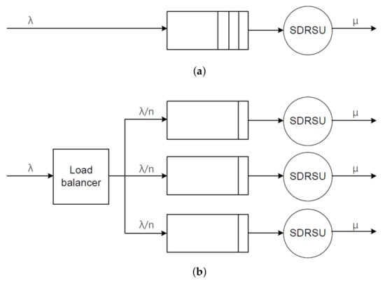 In Figure 5a, reports are processed by an SDRSU in the traditional network, which is abstracted as an M/M/1/K queue. The interarrival times between two messages are assumed to be independent of each other and drawn from the exponential distribution with the parameter . The service times for each report are assumed to be independent of each other and exponentially distributed with the parameter . There is a single server and the system can only accommodate K reports. The reports are served in First in, First out (FIFO). If a new report arrives when there are already K messages in the SDRSU, the new report is dropped. According to [34], when , is obtained via