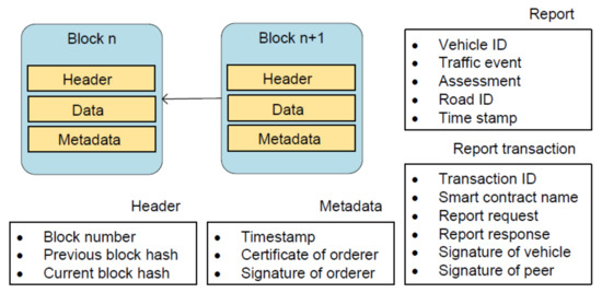 A fully endorsed transaction consists of six parts: transaction ID, smart contract name, report request, report response, and signatures of a vehicle and a vPeerNode. A block is composed of three parts: header, data, and metadata. The header includes block number, previous block hash, and current block hash. The data consists of a list of report transactions, which are invoked by vehicles. Timestamp as well as certificate and signature of a vOrdererNode constitute metadata.