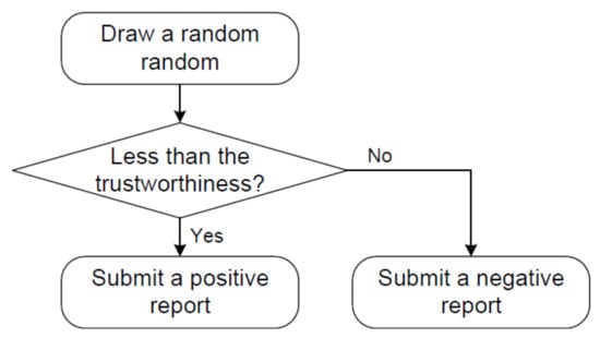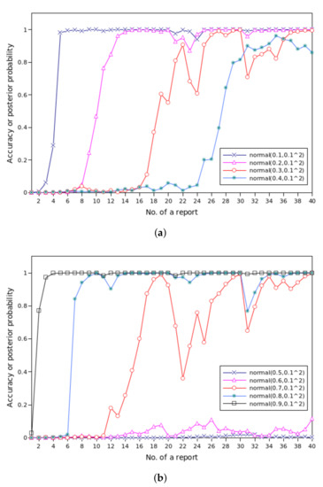 It is assumed that a kind of traffic event happens 10 times a month and the average duration of the traffic event is 20 min. According to Equations (9) and (11), we have and . Therefore, the probability that the traffic event happens in a minute is via Equation (10), and the probability that the traffic event will persist for the next minute is via Equation (12). The trustworthiness of vehicles is drawn from a truncated normal distribution. The mean of the distribution ranges from 0.1 to 0.9, in step of 0.1, the standard deviation is set to 0.1 and the domain is restricted to . Hence, we get the conditional probability in Equations (14)–(17). It is also assumed that there are 10 reports gathered in a minute.