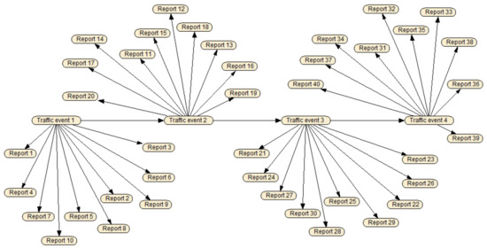 Figure 11 demonstrates the Bayesian network that we create with Netica. Traffic events 1–4 represent the traffic state in four consecutive minutes; reports 1–40 denote the traffic reports submitted by 40 vehicles with different trust levels in the same time period.