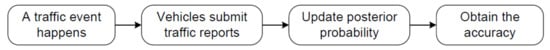 Figure 12 illustrates how to obtain the accuracy. First, we assume a traffic event happens. Second, vehicles submit reports on the event based on their trust levels. Third, the posterior probability is updated via Bayesian network whenever a report is received. Fourth, the derived posterior probability is taken as the accuracy since it estimates the probability of a traffic event that is assumed to be present.