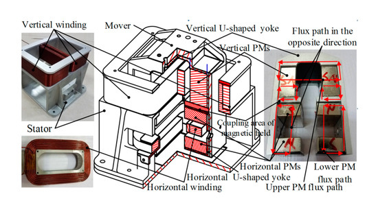 The multi degree of freedom electromagnetic actuators can produce driving force in multiple directions, which are the critical components of the modular magnetic suspension platform [20,21]. According to different driving forces, the magnetically levitated actuators can be divided into the resistance magnetic actuators [22,23,24] and the Lorentz force actuators. Compared with the resistance magnetic actuators, due to the better linearity between the electromagnetic force and the control current, the Lorentz force actuators have many advantages such as no iron loss, high control precision, high bandwidth and so on [25,26]. In Reference [27], a cylindrical Lorentz-force magnetic bearing can output deflection moment but the translational drive cannot be realized. In Reference [28], two groups of circuit board wires are perpendicular to each other in the magnetic field to generate vertical driving force and horizontal driving force. But the effective length of the electrified wires is small and the driving force is low. In Reference [29], the cylindrical windings are arranged in the axial air-gap of cylindrical permanent magnet rings to realize radial driving and axial driving. The movement range is ±1 mm in the radial direction and ±5 mm in the axial direction. Its overall size is 125 mm × 125 mm × 125 mm. In Reference [30], the winding under the permanent magnet (PM) generates vertical driving force and the winding along the side of the PM produces horizontal driving force. The translational motion range of the actuator is ±5 mm but the vertical motion range is only 200 μm. The size of each coil is 40 mm × 40 mm × 17.5 mm. In Reference [31], the rectangular winding and the cylindrical winding are under the cylindrical magnet with axial magnetization. The two windings generate driving forces in the vertical directions and horizontal directions respectively. The overall size is 60 mm × 60 mm × 40 mm and the operation range is 200 μm × 200 μm × 200 μm. However, it has the disadvantages of more magnetic flux leakage and low utilization rate of magnetic field in References [30,31]. The above two degrees-of-freedom (DOF) electromagnetic actuators have the disadvantages of small output force and small moving range. In addition, magnetic field coupling is an important factor to determine driving precision of electromagnetic actuators [32,33,34].