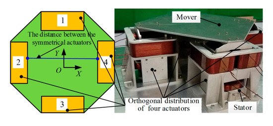 The structure of the modular magnetic suspension platform is shown in Figure 2. Four 2-DOF Lorentz force actuators are distributed orthogonal to each other. The mapping relationship between the motion direction of the platform and the driving force of the actuators is shown in Table 1. With the distance between the two actuators in the symmetrical position adjusted, the bearing capacity and motion range of the platform will be changed accordingly. So the performance of the modular magnetic suspension platform can be improved for varies applications.