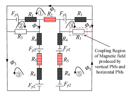 where Hc is the permanent magnetic field intensity and hi is the thickness of the PMs in the magnetization. The reluctance R1–R5 can be expressed as: