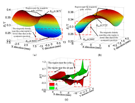 It can be seen from Equations (6) and (4) that the upper flux and the lower flux are coupled in the partition region. The vertical and horizontal components of magnetic flux density in the partition region ③ are calculated, as shown in Figure 5c. The horizontal component Bx and the vertical component By are large, which indicates the coupling of upper flux and lower flux is strong. That is because vertical PMs and horizontal PMs are close and U-shaped yoke affects magnetic flux density distribution. The coupling of upper flux and lower flux is strong in the region near the yoke and is weak in the region near the air-gap. So the yoke is helpful to reducing magnetic flux leakage and increasing air-gap magnetic field strength. But the magnetic field gradient is large and the magnetic density uniformity is poor at the region near the yoke.