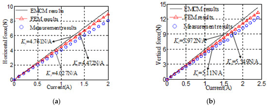 Driving force variation with control current is shown in Figure 9. With the increase of current, the electromagnetic force increases linearly. Due to ignorance of the magnetic flux leakage in the calculation process, EMCM results of horizontal current stiffness and vertical current stiffness, which are 4.761 N/A and 5.972 N/A, both are larger than FEM results and experimental results, respectively. The error between FEM results and experimental results increases as the control current increases. There are some threaded holes on the yoke for processing and assembly, which inevitably increases the magnetic resistance and reduces the magnetic flux density in air-gap. The magnetic resistance of threaded holes is ignored by FEM. So the FEM results are larger than the experimental results. FEM results of the vertical force coefficient and the horizontal force coefficient are 4.472 N/A and 5.549 N/A, respectively. Compared to experimental results of 4.08 N/A and 5.11 N/A, the error is 9.95% and 8.59%, respectively.