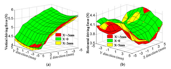 As shown in Figure 7b, the horizontal driving force increases gradually when the mover deflects around the y-axis, because the horizontal winding is close to the surface of the magnetic pole and magnetic flux density increases. The vertical driving force gradually reduces, because the effective length of the vertical coils is just a small amount of increase and the magnetic flux density rapidly reduces. The change rates of the vertical driving force and the horizontal driving force are 4.1% and 2.3%, respectively.