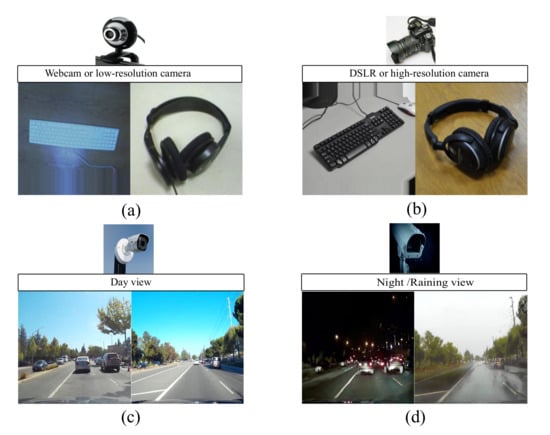 Indoor–outdoor camera surveillance systems [,] are widely used in urban areas, railway stations, airports, smart homes, and supermarkets. These systems play an important role in security management and traffic management []. However, cameras with different properties and positions deployed in these systems can create a distribution difference among the capturing images. This difference leads to the system’s poor performance due to considering primitive machine learning algorithms for recognition []. For example, if a classifier (or primitive algorithm) is trained from source domain images (taken from a DSLR camera), then the trained classifier will not give as expected results when tested on the images collected from some other target domain (taken from webcam camera). A simple solution to improve the classifier’s performance is that it must only be trained with target domain images. However, there are no labeled images in the target domain in practice, and labeling the target domain images is a time-consuming process. Let us consider an example shown in Figure 1 to discuss in detail how the images collected from different environments can cause differences in distribution across domains. In Figure 1, various possibilities, which can cause distribution differences, are presented, such as (1) the images (keyboards and headphones) as shown in Figure 1a,b are collected from different quality cameras, i.e., low-quality camera (webcam camera) and high-quality camera (DSLR); (2) the images as shown in Figure 1c,d are taken with different weather conditions, i.e., a day or clear weather and night or rainy season.