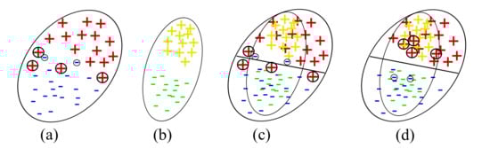 (a) Initial representation of source domain data with two classes (i.e., red plus (+) symbol and blue minus (−) symbol) in 2-d space, where the symbols with circles are outlier data samples. (b) Initial representation of target domain data with two classes (i.e., yellow plus (+) symbol and green minus (−) symbol) in 2-d space. (c) Data representation after application of only feature learning. (d) Data representation after application of jointly feature learning and instance re-weighting.