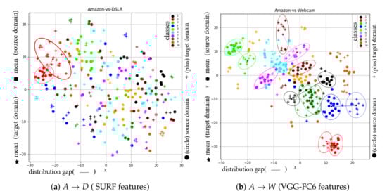 In order to visualize the learned feature space by our proposed method, we considered the t-SNE tool [], through which high dimensional data is projected to 2-D space (or low dimensional space). To show t-SNE representation of feature spaces for tasks (SURF features) and (VGG-FC6 features), we randomly selected 150 samples from each domain and then used two different symbols (such as circles and pluses) to represent different domains and 10- different colors (‘black’, ‘red’, ‘lime’, ‘blue’, ‘orange’, ‘cyan’, ‘magenta’, ‘green’, ‘chocolate’, and ‘maroon’) to represent 10 different classes. Furthermore, to clearly understand the distribution differences between both domains, we used different colored ellipses to represent different classes’ variances belonging to different domains. We also used different colored lines to indicate the distribution gap between same class samples belong to different domains and different symbols such as square and star to represent the average point (or mean point) of each class in the source and target domains. For example, Figure 3a shows the initial feature representation of task with SURF feature, where it can be seen that different class samples from different domains are too close together or there is no uniform cluster for different classes. Therefore, the classification or clustering algorithms can easily misclassify the samples that are too close or near the edge of their own clusters. However, due to the recent advancement in deep learning approaches, by which we can obtain deep features like VGG-FC6 features for the Office + Caltech10 dataset. The deep features (VGG-FC6) representation of task for the Office + Caltech10 dataset is shown in Figure 3b. After comparing the representation of both types of features (as shown in Figure 3a), i.e., VGG-FC6 and SURF, it can be seen that the representation of VGG-FC6 features is much better than the SURF features (Figure 3a). Therefore, the performance of the primitive machine learning algorithm is better for deep learning features. The t-SNE representation of feature spaces learned by the proposed method (STJML) for both the tasks (SURF features) and (VGG-FC6 features) is shown in Figure 4.