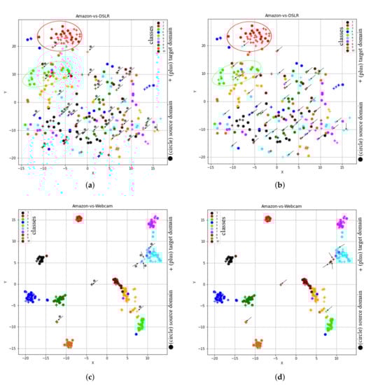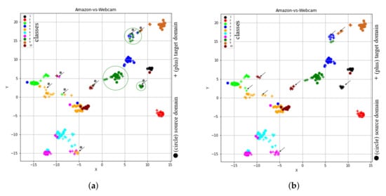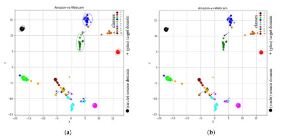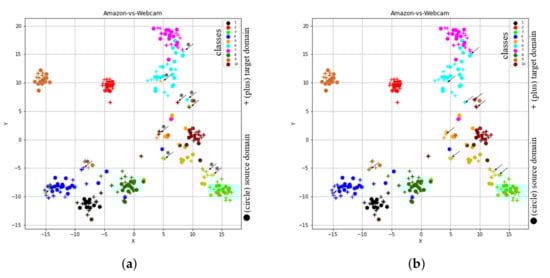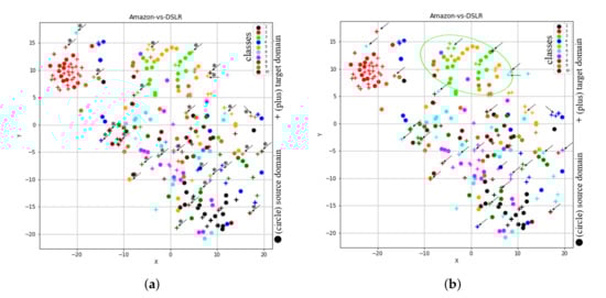 If we exclude consideration of the conditional distribution from our proposed method STJML, the t-SNE views of learned feature spaces by for (VGG-FC6 features) task are shown in Figure 8a,b. Without including this conditional distribution term in our proposed method STJML, the approach achieves 73.90% accuracy, which is much lower than the accuracy (90.85%) achieved by the STJML method. Therefore, we can say that this term greatly impacts the performance of the proposed STJML method if it is not included. If we compare the graph (as shown in Figure 4c) obtained by the STJML method to the graph (as shown in Figure 8a) obtained by , it can be seen that the distribution difference between both domains has not been effectively reduced by the method. For example, the distribution difference between green colored class samples of both domains (plus and circle) is not minimized in Figure 8a (i.e., all the green colored class samples are distributed in different green colored circles), but it can be seen in Figure 4c that all green colored class samples are with in a cluster. Because of not minimizing the distribution gap by the method, we can see that some samples that are being misclassified in Figure 8a (as highlighted by asterisks (*) and arrows (→)) after comparing with the graph in Figure 8b.