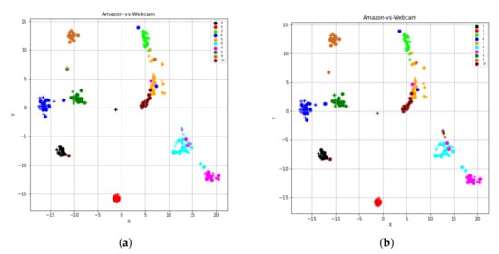 The t-SNE view of learned features from the proposed method after omitting the Laplacian distribution term. (a) (VGG-FC6 features) with the predicted class labels for the target domain. (b) (VGG-FC6 features) with the given class labels for both domain.