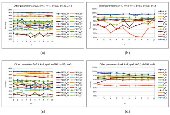 Similar to the parameter , we also vary parameter values from to and keep other parameter values constant as shown in Figure 12c,d. From Figure 12c,d, it can be determined that STJML outperforms at for all tasks of PIE face dataset, while at for some tasks of Office + Caltech dataset with VGG-FC6 features. For better performance, we keep for all tasks (except and tasks of VGG-FC6 features, and and tasks of SURF features) of considered datasets.