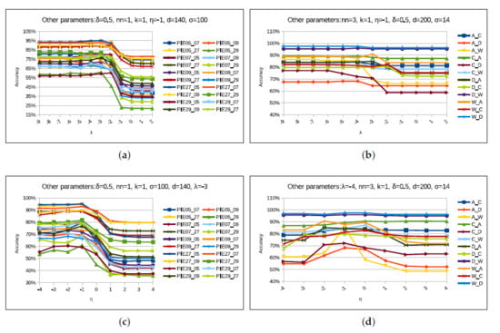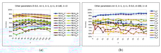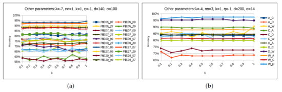 As parameter is the trade-off parameter which regularizes the instance re-weighting term, we vary its values from to and keep other parameter values constant as shown in Figure 12a,b, where the x-axis represents numbers from ‘−n’ to ‘n’, which are actually numbers from to . In Figure 12a,b, it is shown that STJML performs well for and for most of the tasks of both datasets. For better accuracy with respect to this parameter, we keep for all tasks (except and of PIE face dataset. But, we keep for all tasks (except of Office + Caltech with VGG-FC6 features dataset and for all tasks (except , and of Office + Caltech with SURF features dataset.