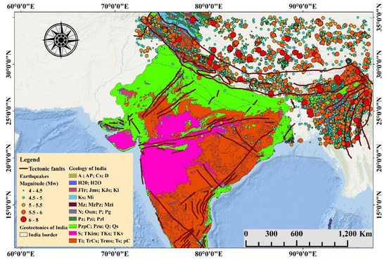 Location of the study area showing the tectonics and detailed geology of the Indian subcontinent with earthquake events of Mw > 4 in the Himalayan region (events and faults information were collected from articles [27,28,29]). (A: Archean, Ap: Archean and Proterozoic, Cmsm: Cambrian sedimentary and metamorphic rocks, Cs: Carboniferious sedimentary rocks, D: Devonian rocks, H20: other regions, JTr: Triassic and Jurassic rocks, Jms: Jurassic metamorphic and sedimentary rocks, Jks: Jurassic and Cretaceous sedimentary rocks, Ks: Cretaceous sedimentary rocks, MzPz: Paleozoic and Mesozoic metamorphic rocks, Mzi: Mesozoic intrusive rocks, N: Neogene sedimentary rocks, Osm: Ordovician metamorphic and sedimentary rocks, Pg: Paleogene sedimentary rocks, Pr: Permian rocks, Pz: undifferentiated Paleozoic rocks, Pzi: Paleozoic igneous rocks, Pzl: Lower Paleozoic rocks, Pzu: Upper Paleozoic metamorphic rocks, PzPc: Paleozoic undivided Precambrian rocks, Q: Quaternary sediments, Qs: Quaternary sand, S: Silurian rocks, TKim: Cretaceous and Tertiary igneous and metamorphic rocks, TKs: Cretaceous and Tertiary sedimentary rocks, TKv: Cretaceous and Tertiary volcanic rocks, Ti: Tertiary igneous rocks, TrCs: Upper Caboniferious–Lower Triassic sedimentary rocks, Tims: Triassic igneous and sedimentary rocks, Ts: Tertiary sedimentary rocks, and Pc: Precambrian rocks).