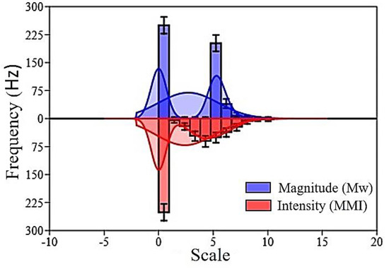 Bi-histogram of magnitude and intensity comparison using frequency that is used for probability assessment (Mw: moment magnitude, MMI: modified Mercalli intensity scale).
