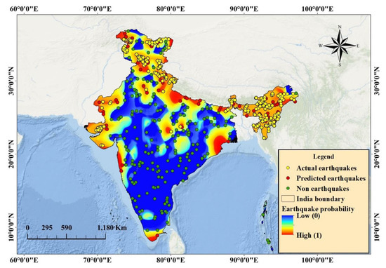 The objective was to produce an earthquake probability map based on experienced events. In this study, the authors did not implement any technique to predict events based on magnitudes, intensity, time, or location. This study is a prediction of classification-based probability assessment; therefore, the areas close to the experienced events will be the probable areas for earthquakes. First, pixels close to the predicted classes can be interpolated to generate a probability map. Second, the entire area can be converted into points for testing using the same model to obtain the pixel values for each point and generate a probability map. Both techniques are effective; however; the second one is more accurate than the first one. In accordance with the old hazard map of India, the Himalayan region belongs to Zone V, which includes Gujarat State in the west, and some cities belong to Zone IV. However, in accordance with the seismic zoning map of India (BIS, 2002), a large part of the Narmada lineament region spreads up to the northern part of the Godavari graben (https://law.resource.org/pub/in/bis/S03/is.1893.1.2002.pdf). Therefore, the hazard estimated in this region is higher in contrast with the Indian Standard code. The current study of probability mapping is linked to the hazard map, which is under Zone IV but with low probability. Southern portions, including Tamil Nadu, are under passive margin and exhibit higher ground motion based on the hazard map (Zone III) while presenting low probability in accordance with the obtained map. The western portions of some states, such as Bengal and Orissa, and the western part of Madhya Pradesh, Chhattisgarh, Andhra Pradesh, and Karnataka are estimated as moderate to low probability and low hazard zones on the basis of the seismic zoning map (Figure 10). Therefore, these areas are considered the stable shield of peninsular India. However, the resulting probable areas are nearly similar to other parts of the hazard map of India. The resultant earthquake probability map indicates that priority should be focused on the Central Himalayas and Northwest, Northeast, and Shillong areas of the Indian subcontinent; because of the complicated tectonics and active faults in areas where no large earthquake has occurred since the 2011 Sikkim earthquake. Other priority areas experienced mild events such as Maharashtra, Kachchh region, cratonic regions, and rift basins in India that can be considered for future hazard and risk studies. A national database of active faults should be created, and event prediction should be initiated using GIS [55]. The database would enhance the geological and earthquake hazard-related issues under different tectonic settings using machine learning techniques [56,57].