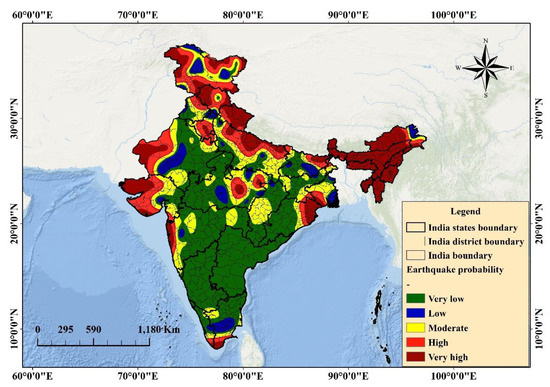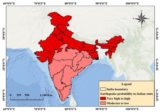 Table 5 presents the percentage of each zone, including the area (km2) contributing to active tectonics. The maximum area is within the very-low-probability zone (approximately 1,776,265 km2), followed by the low-probability (139,123 km2), moderate-probability (378,887.6 km2), high-probability (591,240.5 km2), and very-high-probability (712,375 km2) zones. Very-high- to very-low-probability areas comprise approximately 19.8%, 16.43%, 10.53%, 3.87%, and 49.37% of the aforementioned zones, respectively. A two class-based probability map was developed and presented in Figure 9. Several states that fall under very-high- to high-probability zones include Jammu, Kashmir, Northern Bihar, Chandigarh, Delhi, Haryana, Central Madhya Pradesh, Himachal Pradesh, Panjab, Gujrat, Rajasthan, Uttar Pradesh, Uttaranchal, Maharashtra, and northeastern states, where the total population comprises approximately half of India’s population based on the current census data (Table 5). The states that fall under the moderate- to very-low-probability zones are Tamilnadu, Kerala, Odisha, West Bengal, Chhattisgarh, Andhra Pradesh, Karnataka, the western part of Madhya Pradesh, Eastern Rajasthan, Central Bihar, Jharkhand, and some North Indian states.