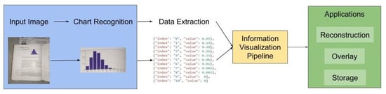 Automatic main process of chart recognition, from the input image to applications. The main process can transform a static environment in a rich user interface for manipulation of data. The information visualization pipeline is environment free, allowing the applications to be used in many environments. This is only possible when the initial step cleans the chart and gives information (blue area).