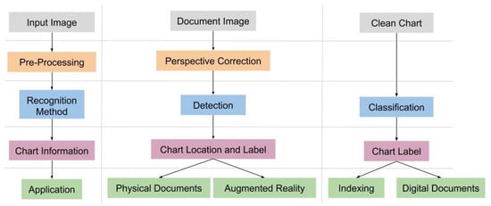 In this way, chart recognition can be defined as a process that is composed of three computer vision tasks: classification, detection, and perspective correction. Following the literature, the main usage scenario of chart recognition is to discover the chart type [2,3,5,8,9,10,11], using it to choose a proper data extraction pipeline. Nevertheless, even without data extraction, there are scenarios that chart recognition can be applied to. Take a set of digital documents as context, like a set of medical papers [12]. In this scenario, it can be useful to create metadata by chart type to support searches.
