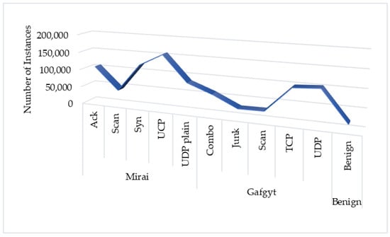 These experiments are done using the dataset, N-BaIoT []. This dataset has a total of 849,234 instances, including 17,936 benign and 831,298 attack instances, which was captured by running the most dangerous IoT malware such as Mirai and BASHLITE [,]. ANN was applied for the experiments with the different well-known activation functions. This dataset is public and collected from an IoT environment, including popular IoT devices [,]. It has eight different classes of attacks based on two botnets and one benign and has 115 traffic features. The distribution of the instances in the dataset is shown in Figure 2.