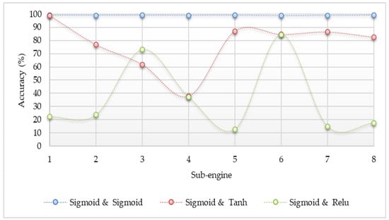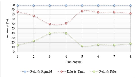 The different activation functions such as sigmoid, Tanh, and ReLU were applied to determine which one is the best option in the proposed system. The accuracy result comparisons are shown in Figure 3, Figure 4 and Figure 5. The accuracy in the experiment was calculated by Equation (5). Where, “TP” is true positive which indicates the number of attack classes correctly classified, “TN” is true negative which indicates the number of benign classes correctly classified, “FP” is false positive which indicates the number of benign classes wrongly classified as an attack, and “FN” is false negative which indicates the number of attack class wrongly classified as benign. According to the experiment results, the sigmoid function gave the best accuracy results.