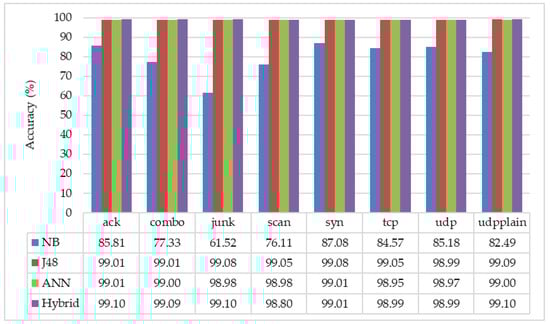 We compared the detection accuracy between the formal detection scheme using different classifiers, and our proposed detection scheme with a hybrid classification is shown in Figure 6. For the formal detection scheme, we used different machine learning algorithms, such as NB, J48, or ANN. In this detection scheme, a machine learning algorithm is needed to classify whether the incoming pattern is an attack or not. In our scheme (described in Figure 1), we proposed the sequential detection architecture with different attack detection engines with the “hybrid classification.” Each of the sub-engines need to be assigned with the most suitable classifier, and the selected classifiers can be different in each engine to have the best detection performance. For this purpose, we found the most suitable classifier for each sub-engine by comparing the accuracy values (which are based on Equation (5)).