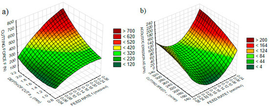 The basic and most influential parameters on cutting force are accepted as being feed rate, depth of cut and specific cutting force [75]. Increasing the feed rate and depth of cut enhances the cutting force as a result of increasing the cutting area [3]. The cutting force indicates an accelerating behavior, and reaches the maximum value with the combined effect of the highest feed rate and depth of cut (Figure 4a).