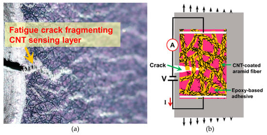 Illustration of carbon nanotube (CNT)-based fatigue sensor concept: (a) photo of crack fracturing the sensor and (b) sensing principle using electrical resistance measurements across applied electrodes (white lines).