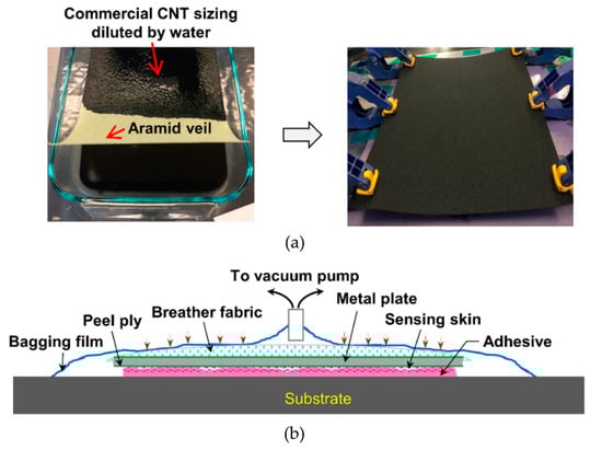 Fabrication process of proposed CNT fatigue sensor: (a) dipping aramid veil into CNT sizing agent and drying in the oven; (b) implementation of vacuum bagging technique to bond sensing layer to metal substrate.