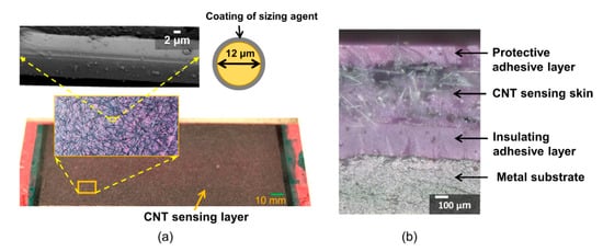Carbon nanotubes (CNTs) have been demonstrated to be effective as piezoresistive sensors that enable high sensitivity to the detection of deformation and damage in structures. Specifically, CNT-based thin films have been shown to work well as strain sensors [34,35,36,37,38]. The small size of the nanotubes combined with their ability to create electrically conductive networks offers the potential to detect deformation and damage of composite materials in situ and in real time. For example, damage in fiber composite materials can be monitored by dispersing carbon nanotubes in them [39,40,41,42]. CNT-based sensors have also been used for monitoring interfacial integrity between substrate and adherents [43,44,45].