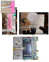 Test setup with ASTM E647 contact tension (CT) specimen instrumented with CNT sensor and back-face strain (BFS) gage: (a) fatigue-cracked specimen with inset showing fatigue crack and crack length measurement, (b) three-dimensional digital image correlation (3D-DIC) setup for the potential false positive evaluation test specimens, and (c) crack-stop hole test specimen to examine fatigue crack re-initiation (shown without protective outer adhesive and silicone layers). Yellow arrows in (a), (b), and (c) show load application points.