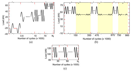 The loading protocol for the continuous crack propagation monitoring test is illustrated in Figure 5a; it satisfies linear elastic fracture mechanics (LEFM) conditions, which are required to compute crack length using BFS measurements. First, compression–compression constant amplitude (CA) cyclic loading (Cycles 1 to 600) was applied to initiate a crack at the notch tip, followed by tension–tension CA cyclic loading (Cycles 601 to 70,000) with a load ratio, R = Pmin/Pmax ≈ 0.1 to grow the crack to a length, a = 53 mm. Pmin and Pmax represent minimum and maximum peak load amplitudes, respectively. Note that after 10,000 cycles the loading frequency was increased from 1 to 2.5 Hz and Pmax slightly increased to accelerate the test. Subsequently, tension–tension CA cyclic loading with a load ratio, Pmax = 66.7 kN and R = 0.67, was applied to grow the crack until the specimen fractured.