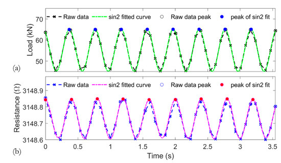 Sample data with selected peaks for both raw and sine curve-fitted data: (a) load vs. time and (b) resistance vs. time.