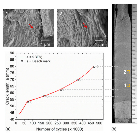 Fractographic approach to validate calculated crack length using BFS data. The figure shows (a) a plot of crack length vs. number of load cycles with (b) an optical image showing the corresponding beach marks directly observed on the fracture surface. The high-magnification SEM micrographs (insets 1 and 2) show locations 1 and 2 of fatigue striations with different spacings (red arrows in each inset point to an individual striation).