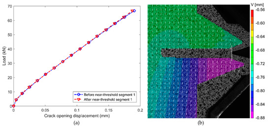 (a) Crack opening displacement before and after near-threshold loading cycles. (b) 3D-DIC displacement contour plot. White line with circular ends shows where crack mouth opening displacements (CMODs) were calculated and white arrows represent the displacement vector field.