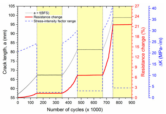 Figure 10 shows crack length, resistance change in the sensor, and stress intensity range calculated from the applied loads vs. number of applied load cycles. The near-threshold regimes are shaded in yellow and correspond directly to the shaded regions in Figure 5b. In the near-threshold regimes, CA cyclic loads were designed to keep the range of stress-intensity factors, ∆K, close to the near-threshold stress intensity factor of A36 structural steel, which was found to be approximately 3 MPa-m1/2 [57]. In the near-threshold crack growth regimes, the fatigue crack did not grow notably (black line (thinner) in Figure 10), which is consistent with the 3D-DIC measurements (discussed regarding Figure 9). The resistance change in the CNT sensor (solid red line in Figure 10) follows the same trend, also with no significant resistance change occurring during the near-threshold crack growth regimes. Thus, fatigue crack activity can be monitored using the resistance response of the sensor and the CNT fatigue crack sensor does not report false positives under near-threshold crack propagation conditions.