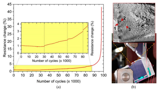 Crack re-initiation from a crack-stop hole: (a) resistance change (%) vs. number of applied load cycles. Dashed lines in inset show the number of load cycles corresponding to beach marks; (b) failure of the specimen with crack-stop hole beach marks (inset) marked by arrows numbered 1 to 3.